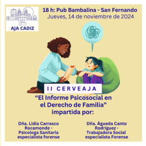 Os hacemos llegar una nueva CERVEAJA. En esta ocasión, tendremos la oportunidad de aprender sobre la importancia de “El informe Psicosocial en el Derecho de Familia” y se desarrollará en la localidad de San Fernando, en el Pub Bambalina, sito en la Calle Las Cortes, 14.