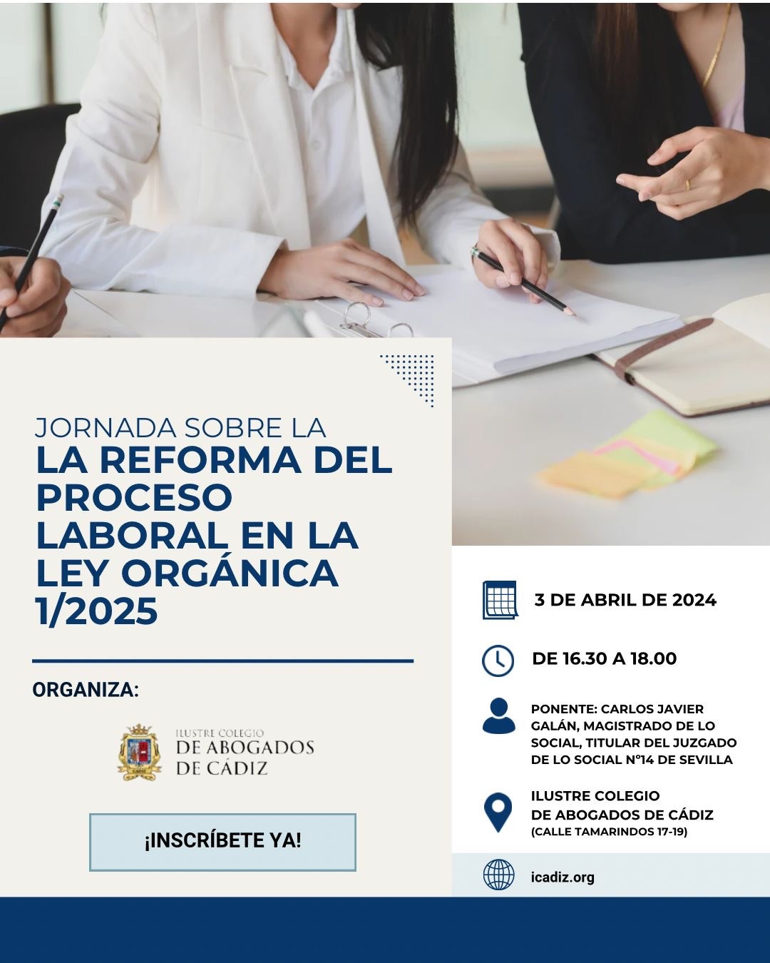 La primera de las sesiones, de carácter semi presencial, será el día 3 de abril de 2025 a las 16.30h en la sede de nuestro Colegio en Cádiz, y tratará sobre la Reforma Procesal en el orden Jurisdiccional Social.