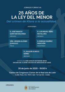 El Ilustre Colegio de Abogados de Cádiz, conmemorando los 25 años de vigencia de la Ley 5/2000 del Menor, ha organizado una Jornada Formativa titulada “DEL CRIMEN DE KLARA A LA ACTUALIDAD, 25 AÑOS DE LA LEY DEL MENOR”.