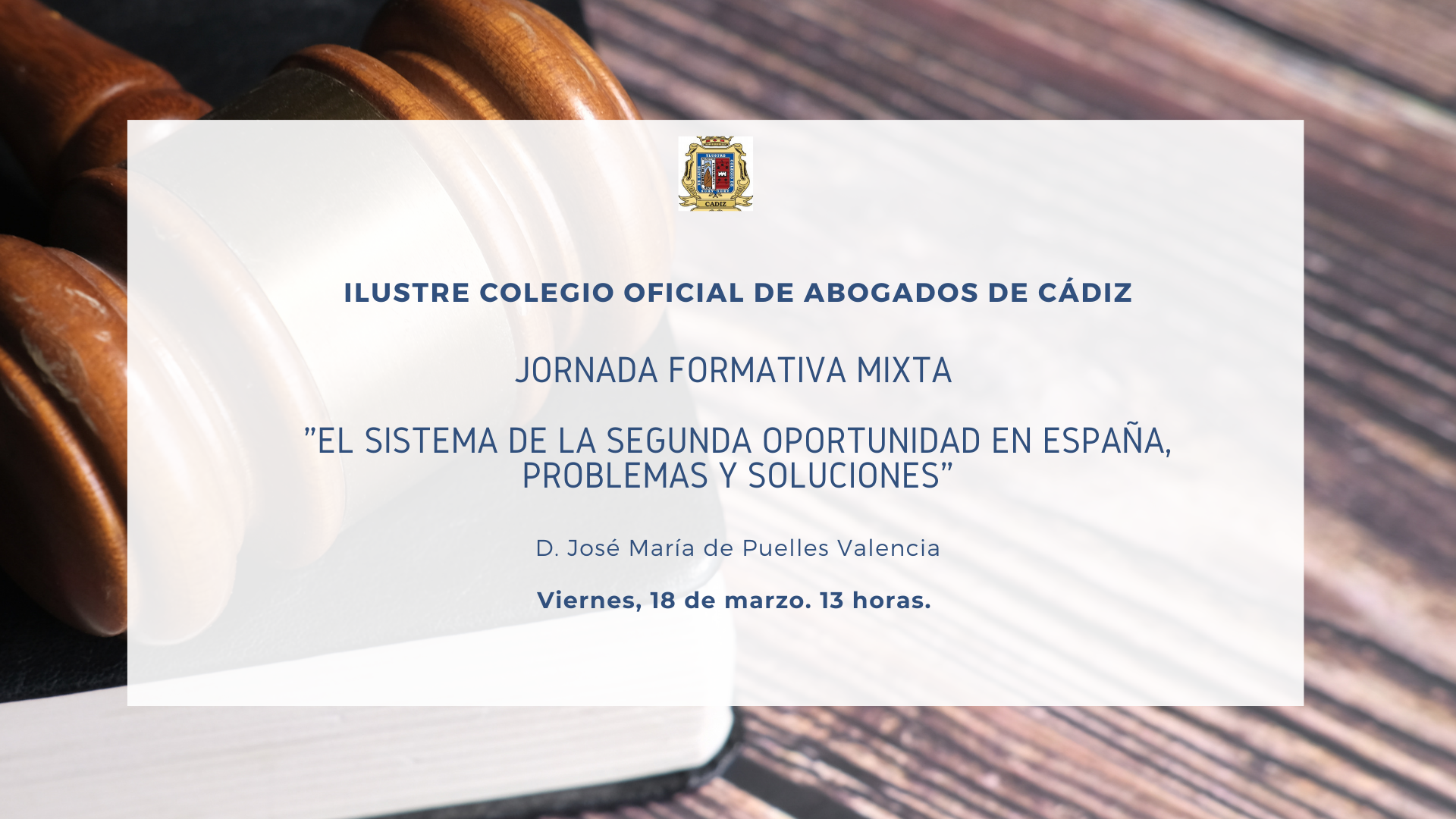 El Colegio de Abogados de Cádiz invita a sus colegiados a asistir a la ponencia que se celebra el viernes 18 de marzo a las 13 horas en nuestra sede colegial por parte del Abogado D. José María de Puelles Valencia, sobre «El sistema de la Segunda Oportunidad en España, problemas y soluciones».