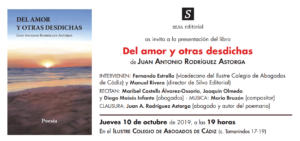 El próximo 10 de octubre tendrá lugar la presentación del Libro de Juan Antonio Rodríguez Astorga: Del amor y otras desdichas, dentro de las acciones realizadas por nuestro Colegio Aula de Cultura del ICA Cádiz. Será a partir de las 19 horas en nuestra sede.